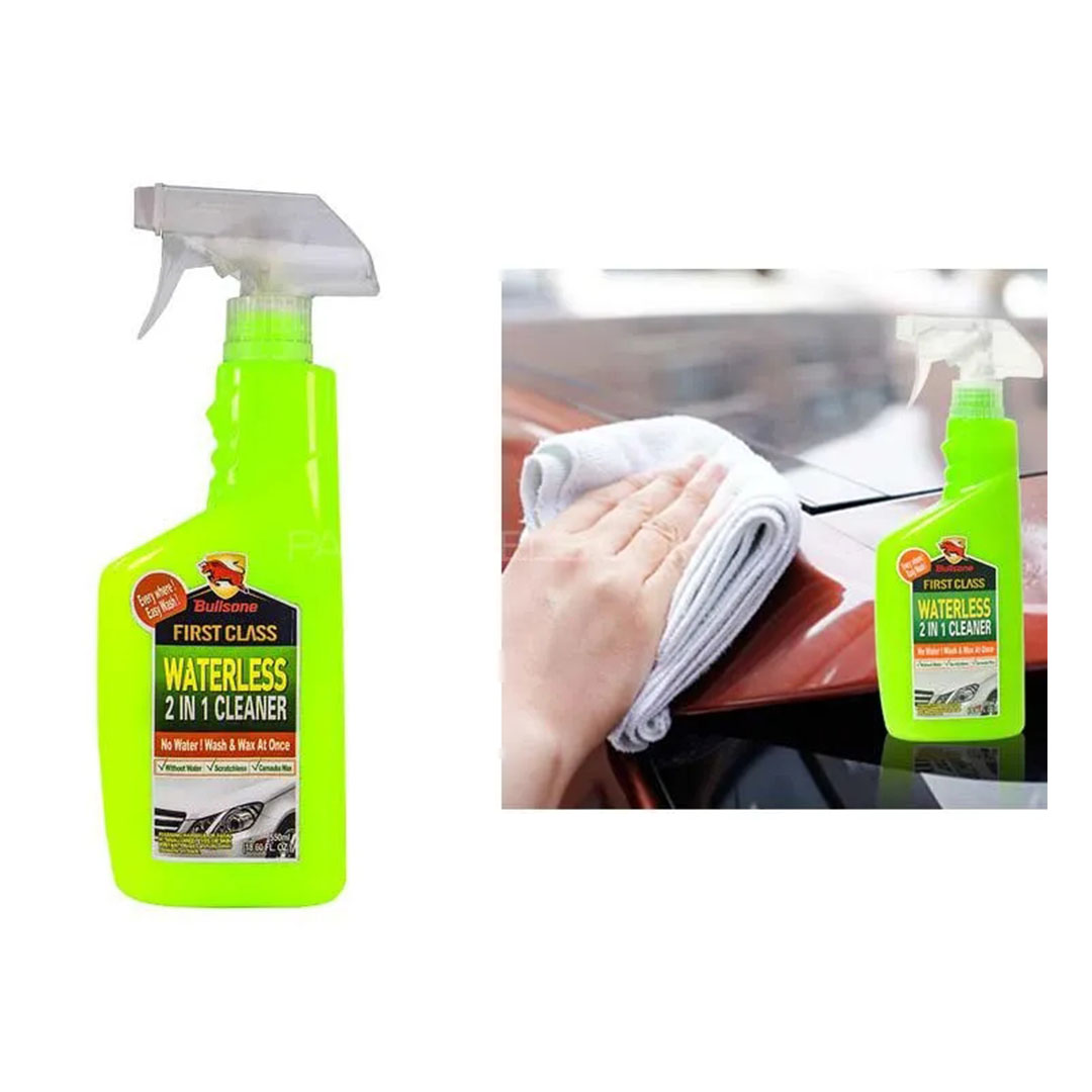 This image shows a bottle of Bullsone First Class Waterless 2-in-1 Cleaner. This is a car care product designed to clean and wax your vehicle without using a single drop of water.Here are the key details about this product:Product OverviewBrand: Bullsone (a well-known Korean car care brand).Type: Waterless Wash & Wax.Quantity: 550 ml (18.60 fl. oz.).Key Ingredients: Contains Carnauba Wax for a high-gloss finish and protection.Main Features2-in-1 Action: It cleans the dirt off the car and applies a layer of wax at the same time.No Water Needed: Perfect for people living in apartments or areas where washing with a hose is difficult.Scratch-less Formula: Designed to lift dirt away from the surface to prevent scratching the paint during the wipe-down.Easy to Use: You simply spray it on a dirty panel and wipe it off with a clean microfiber towel.How to UseSpray: Apply the cleaner directly onto the car’s surface (work in small sections).Wipe: Use a clean, soft microfiber cloth to gently wipe away the dirt.Buff: Use a second dry microfiber cloth to buff the area for a shiny, waxed finish.Note: This product is best for cars with light to moderate dust. If your car is covered in heavy mud or thick grit, it is still safer to rinse it with water first to avoid scratching.